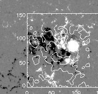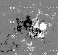 - There are two bright kernels in the HXR image. One represents a positive magnetic field and the other represents a negative magnetic field. In order to sum up the total brightness in each of the two kernels, the two plots need to be made to be the same size. This is done by simply cropping out the excess magnetogram from the overlaid plots shown above.