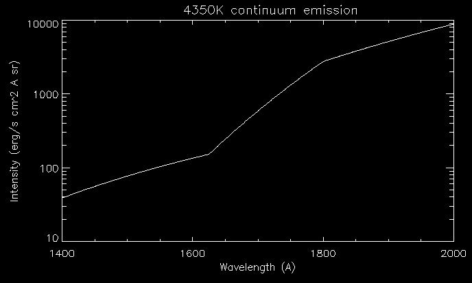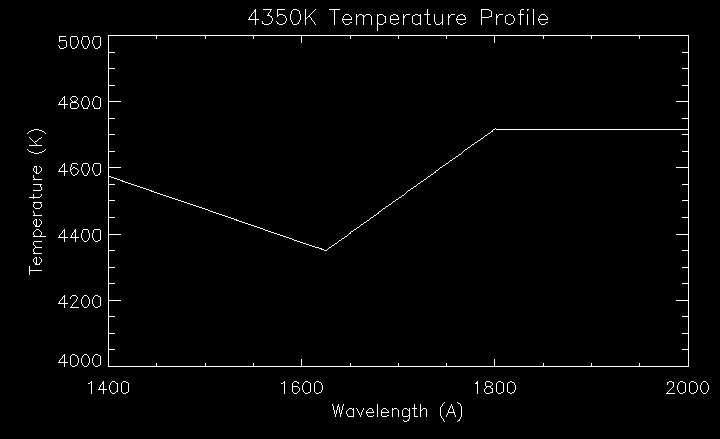 In this model, we do not assume that the sun is a perfect blackbody, but rather that the temperature is a function of the wavelength. Using a previous paper, I used two linear functions to model this. This model requires 3 parameters from published data in the program that generates the spectrum: the slope of the two lines, and the point at which they intersect (wavelength with the lowest effective temperature). For this first graph, I used slopes of -1 and 2.1, with the minimum occurring at 1625Å. The emission with a minimum temperature of 4350K can then be calculated: