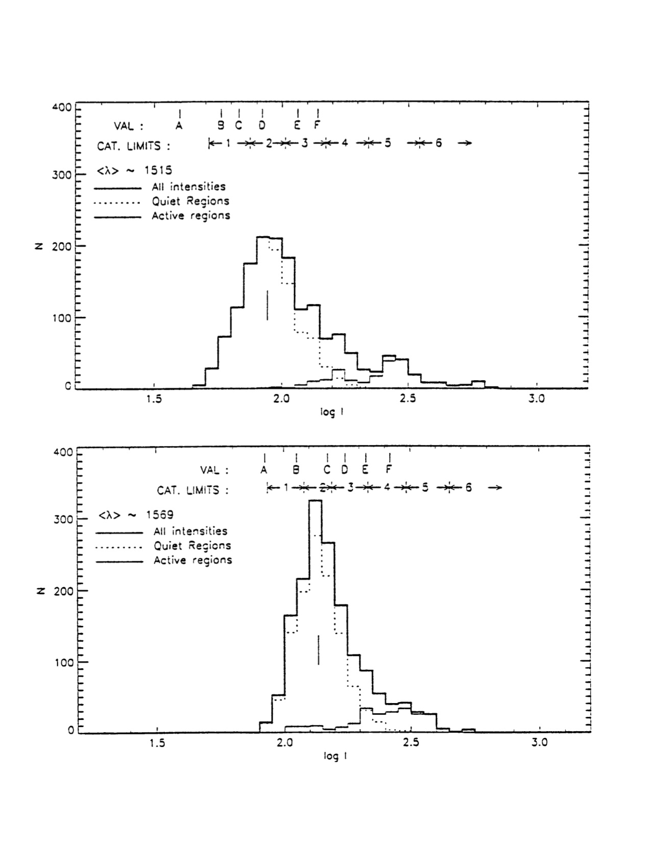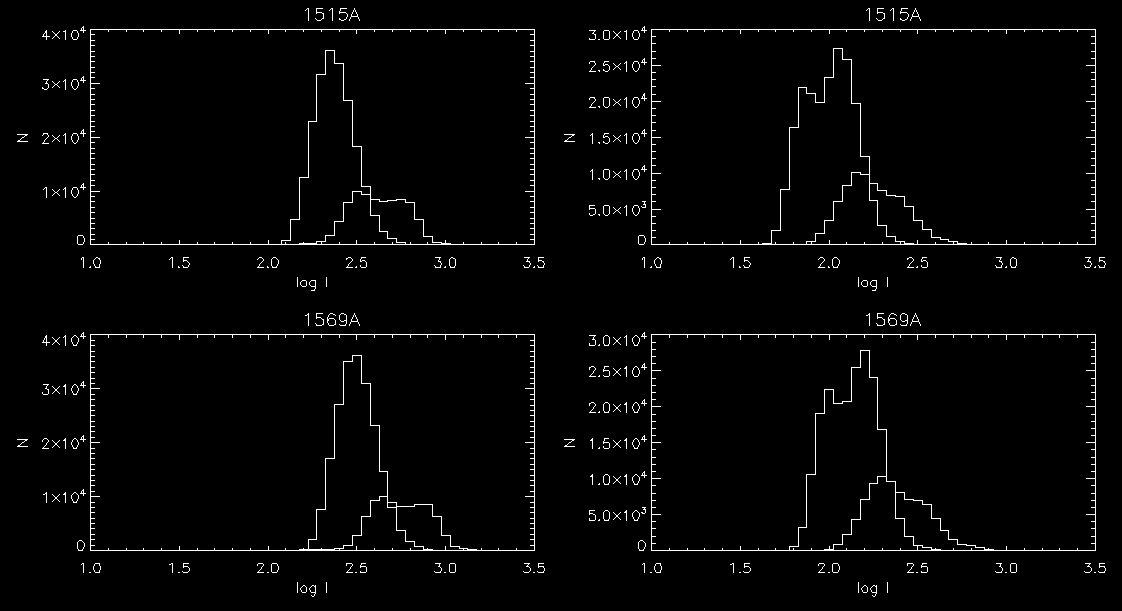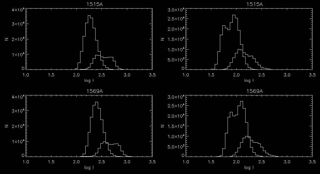 Using programs similar to the previous ones, I was able to construct a histrogram for the two wavelengths 1515Å and 1569Å to compare to previously published data. The graphs on the left were calculated with 1600Å band data, on the right with 1700Å data. The upper line is the quiet sun, the lower is active regions. Minimum at 1600Å
