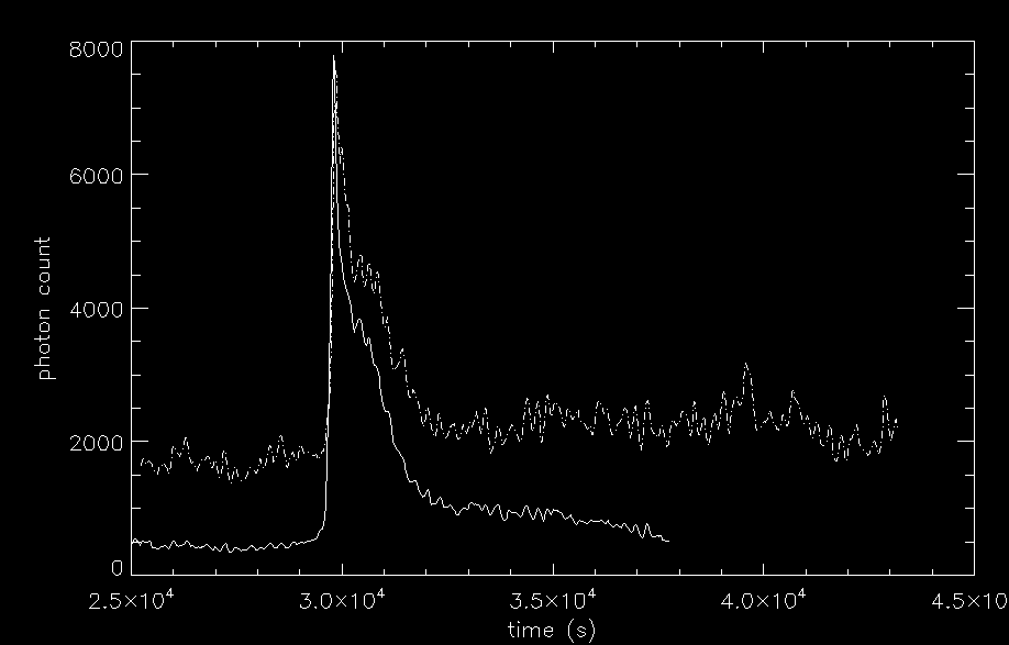 Here's the plot for the brightness of one such pixel. The solid line is from the 1600Å band,