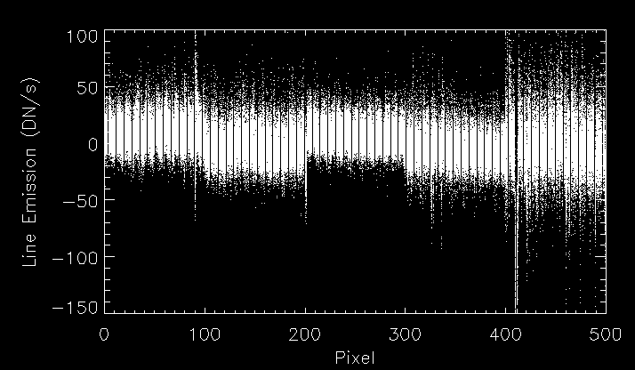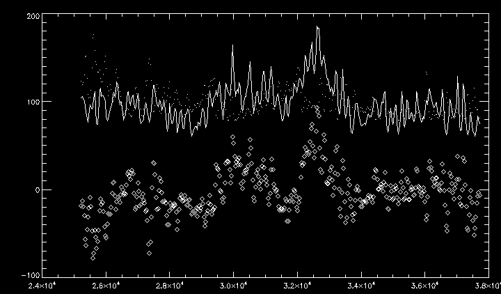 When I examine the emission from one of these quiet pixels (in this case, pixel 500,70 at t=0), this the is resulting graph. The solid line is the 1600Å data, the dotted line is the expected continuum emission (based on the temperature from the 1700Å data), and the the diamond line is the difference - the line emission.