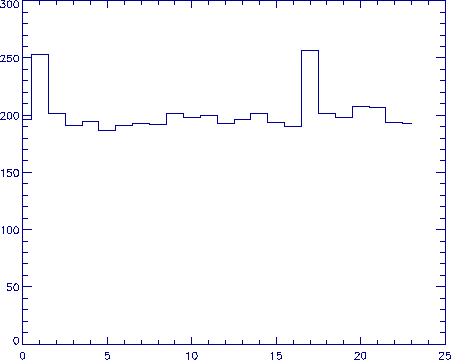End to end delay time along a typical route from MSU to ISAS (ms), as a function of time of day (Mountain Standard Time, UT - 7 hours).