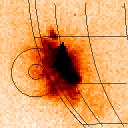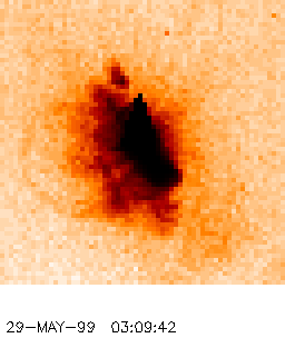 The 29-May-1999 structure, in still images. The frames below show the appearance at 03:09:24 UT, the right-hand frame is annotated to guide the eye to the outer bubble and the core. The grid lines are heliographic latitude and longitude, and show the position of the flare on the Sun (in this case, near the southeast limb).