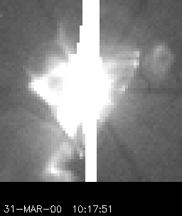 The 31-Mar-2000 structure, in still images. The frames below show the appearance at 10:17:51 UT, the right-hand frame is annotated to guide the eye to the outer bubble and the core. The grid lines are heliographic latitude and longitude, and show the position of the flare on the Sun (in this case, near the northeast limb).