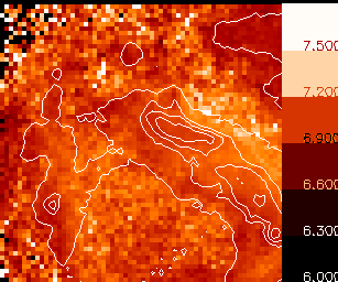 Contours mark levels of intensity in raw SXT image. Log of temperature is plotted according to color legend on right-hand margin.