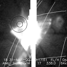 The 31-Mar-2000 structure, in still images. The frames below show the appearance at 10:17:51 UT, the right-hand frame is annotated to guide the eye to the outer bubble and the core. The grid lines are heliographic latitude and longitude, and show the position of the flare on the Sun (in this case, near the northeast limb).